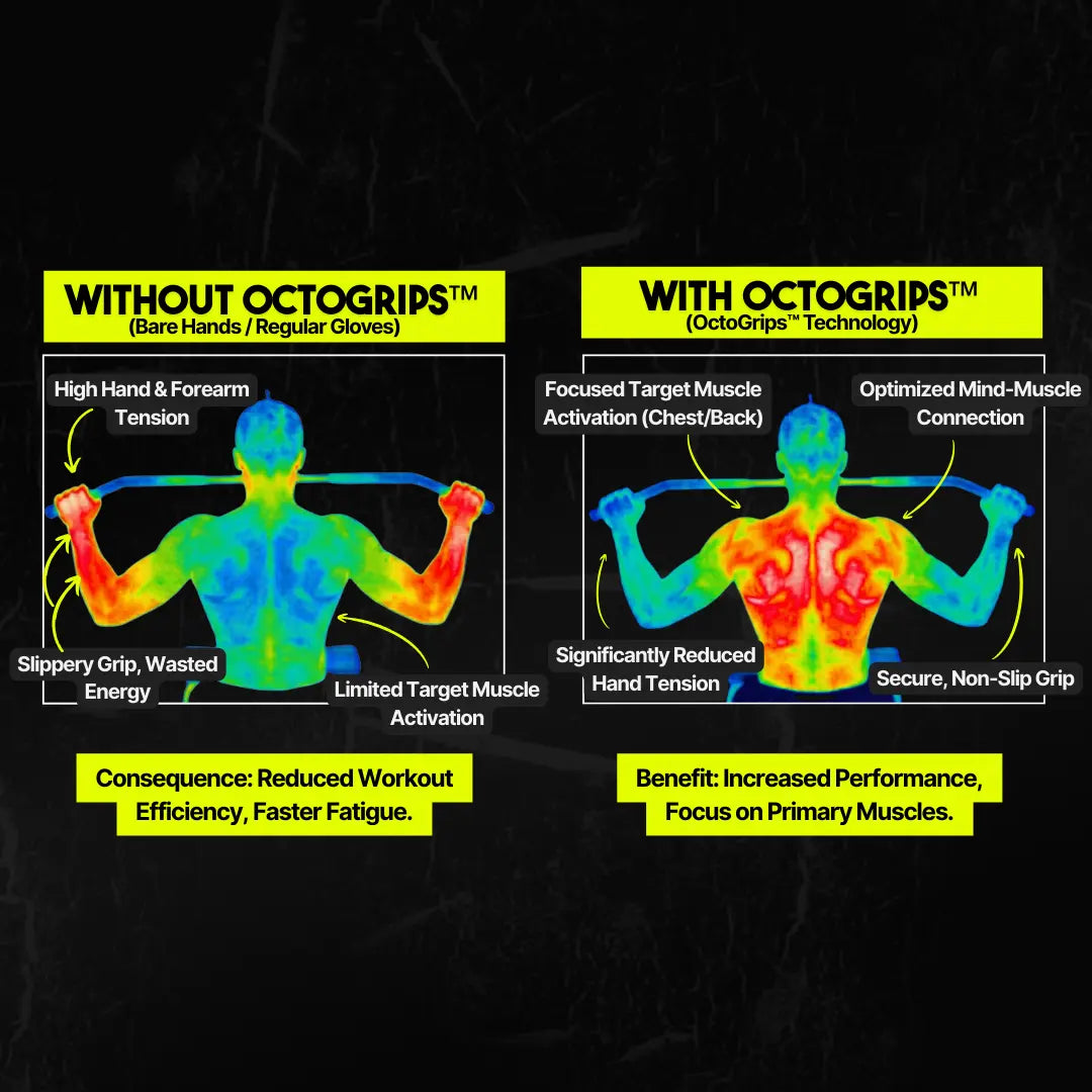 The results are clear: greater muscle activation in targeted areas (shown in red) and reduced hand & forearm strain (shown in blue). With OctoGrips™, you can achieve 20–25% more reps per set, maximizing both efficiency and performance in every workout.